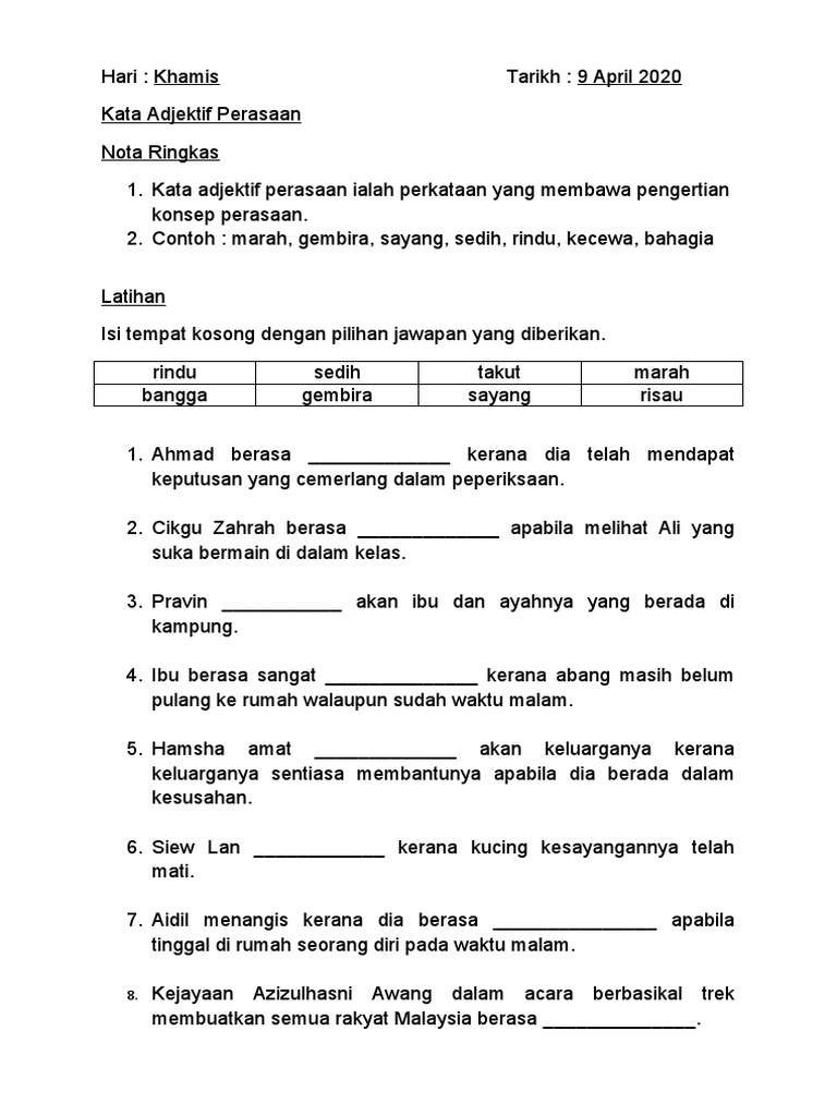 Kata Adjektif Pdf Latih Tubi Tatabahasa Kata Adjektif Kata Adjektif Kata Adjektif Ialah Perkataan Yang Menerangkan Sifat Sesuatu Benda Keadaan Atau Course Hero
